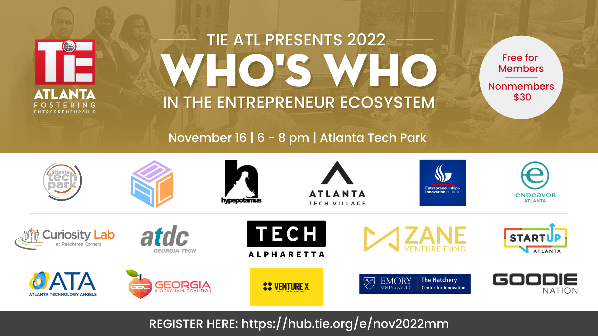 As the benefit of building genuine business relationships becomes more evident by the day, TiE is hoping to connect entrepreneurs with resources, funding, and key players in the startup ecosystem through their signature event "Who's Who in ATL's Entrepreneur Ecosystem."