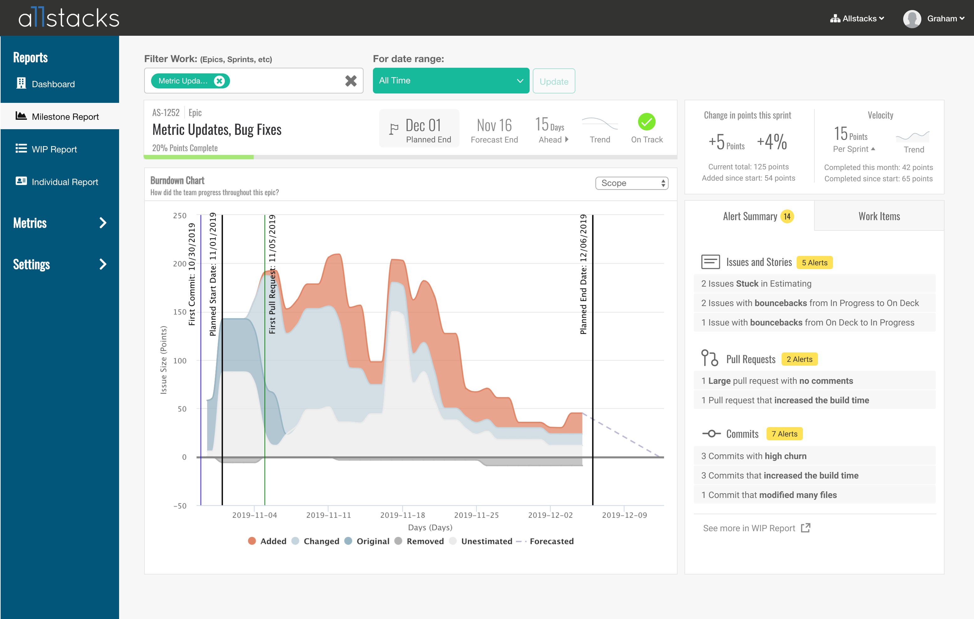 In that case, Allstacks was able to look at a client initiative and discovered a problem that made the case for hiring more palatable to the company’s leadership. “With our data, we could see that the product development team had a problem, where there weren’t enough people assigned to the totality of work. It looked innocuous at first, but with all the new work, things kept getting piled onto one person, so delivery kept slipping down. And we were able to see those patterns emerge, so we were able to get more developers on that team.”