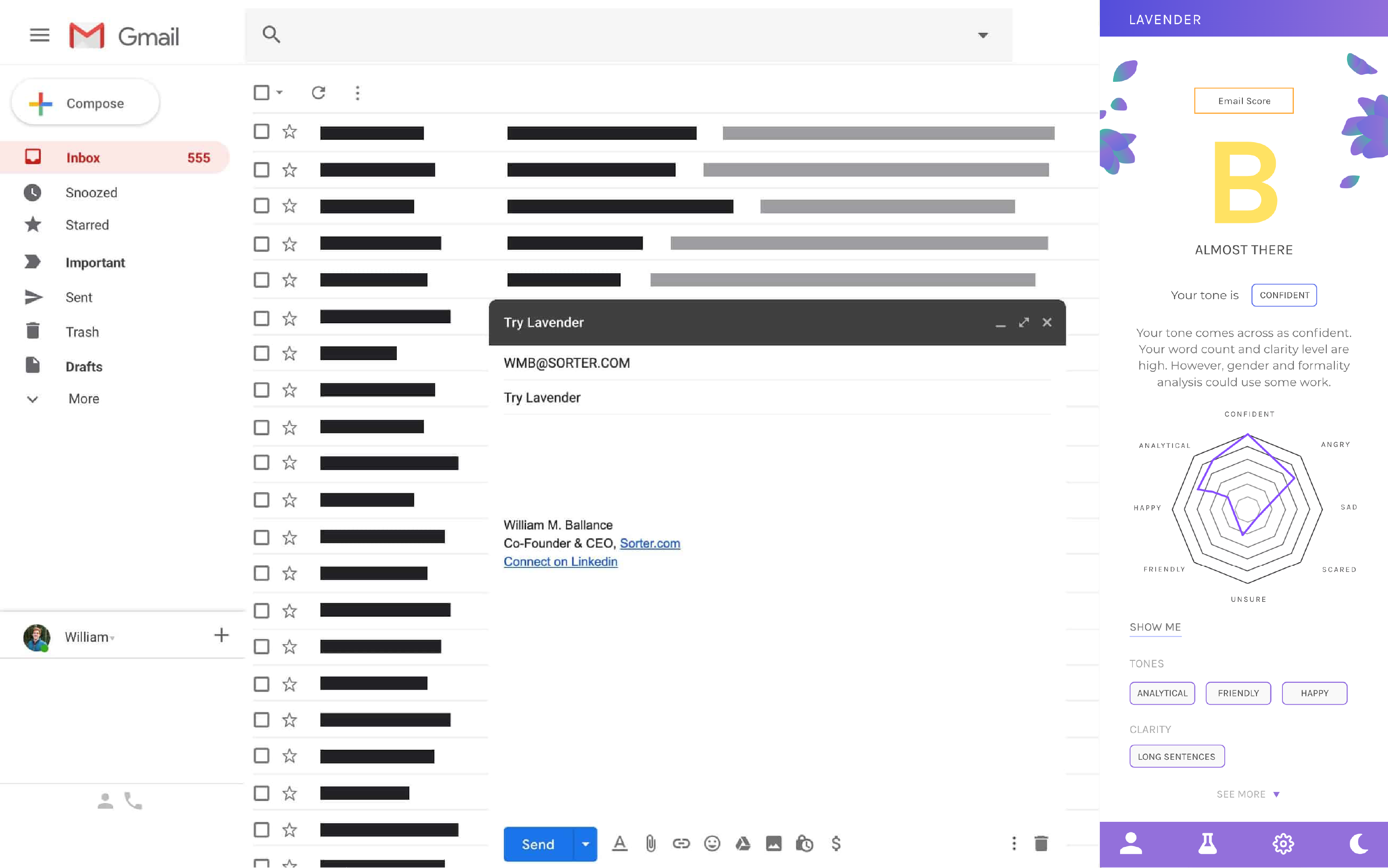 Lavender, a Chrome extension email plugin from the folks behind Sorter, might sound a bit like Grammarly, which you may have seen advertised on TV as a way to improve your grammar when writing online. But rather than focusing on typos, misspellings and whether or not you’ve put the correct their there, Lavender analyzes your email in real time with email gamification and behavioral science, using its calculations to make suggestions for increasing your electronic message’s “emotional intelligence.”