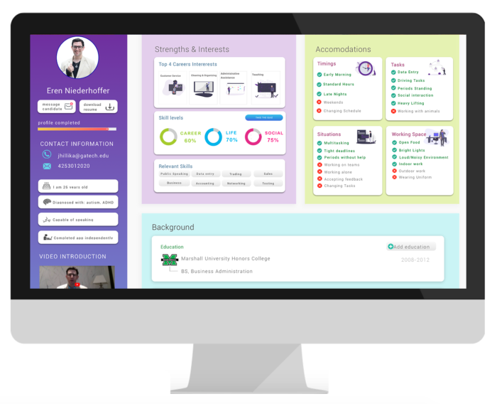 Like other candidate marketplaces, Mentra allows individuals to add experience and skillset to a profile, along with specific requested accommodations. An algorithm matches candidates with recruiters and places them into interviews.