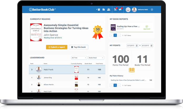 The platform gamifies that job development and training by providing a company-approved list of recommended titles that align with its values and goals, as well as encourage skill set growth. After the employee finishes their selected book, they submit a short "book report" to earn the points.