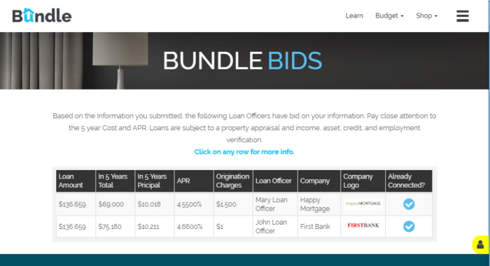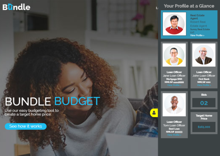 With Bundle's marketplace, the home buyer can use the online budgeting tool to organize monthly expenses and decide on a home price target. Once they enter their loan target and down payment, they move on to the marketplace where they will receive real bids from loan officers.