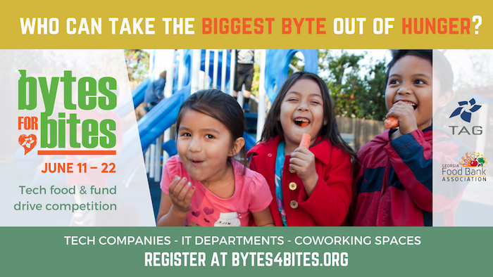 TAG is teaming up with the Georgia Food Bank Association to engage Georgia’s technology and startup community in the fight against hunger through Bytes for Bites, a friendly food and funding competition to benefit the regional Food Banks.