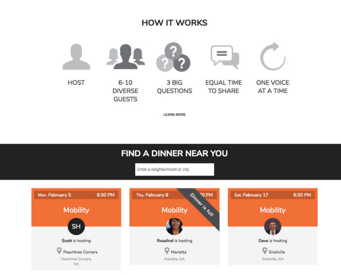 The platform is designed to make it easy for anyone to host or attend a Civic Dinner. First, a potential host can browse conversations available near them by entering in their city on the homepage. Each conversation page describes the topic in more detail and offers the options to “Attend a Dinner”, “Host a Dinner” or “Request an Invite.” We’ve built a number of tools to make it easy for hosts to recruit guests with one click custom invitations and automatic reminders and follow-up emails, so the host can worry less about communications and focus instead on the meal and meaningful conversation.