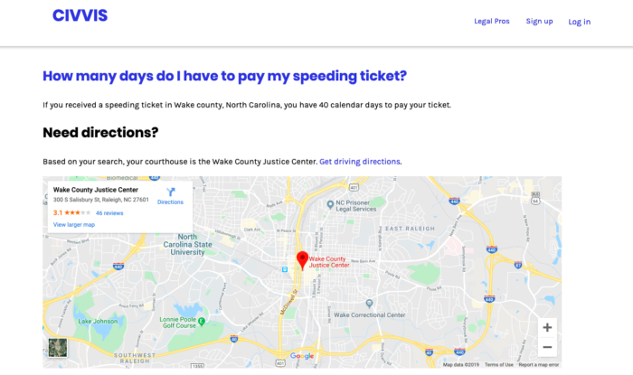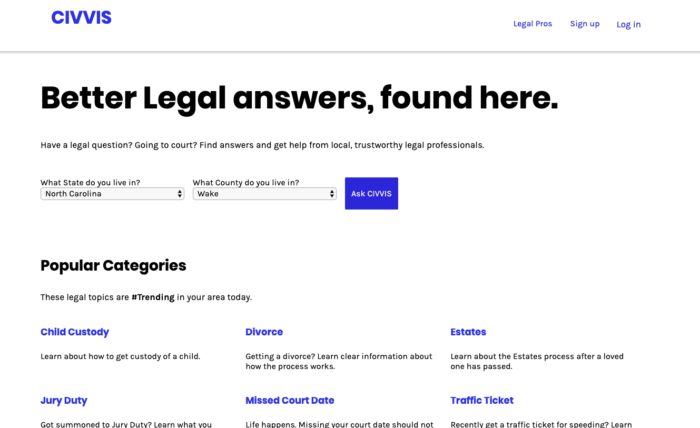 The natural language platform connects consumers to trusted legal solutions. Through Civvis, people can ask the conversational search engine legal questions in plain language. Based on their questions, the platform will match up their answers to their local courthouse and deliver specific court logistics to follow, including the necessary forms. No more messy handwriting.