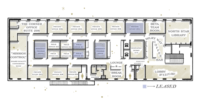 Members will have access to a library, conference rooms, a coffee bar, and a podcast studio.