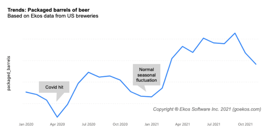 According to data collected by Ekos, US brewers witnessed a steep increase in the amount of packaged barrels of beer over the course of 2021. “Overall, our U.S. customers have increased their packaged production more than 50% from 2020 to today,” the team added.