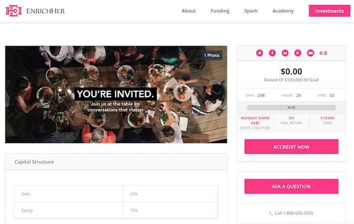 EnrichHER thinks women can benefit even further from crowdfunding with a female-specific platform. The startup, based in Atlanta, has developed a fully-accredited (by both the Financial Regulatory Authority and the SEC) online platform for women entrepreneurs to access debt-based funding to build their businesses.