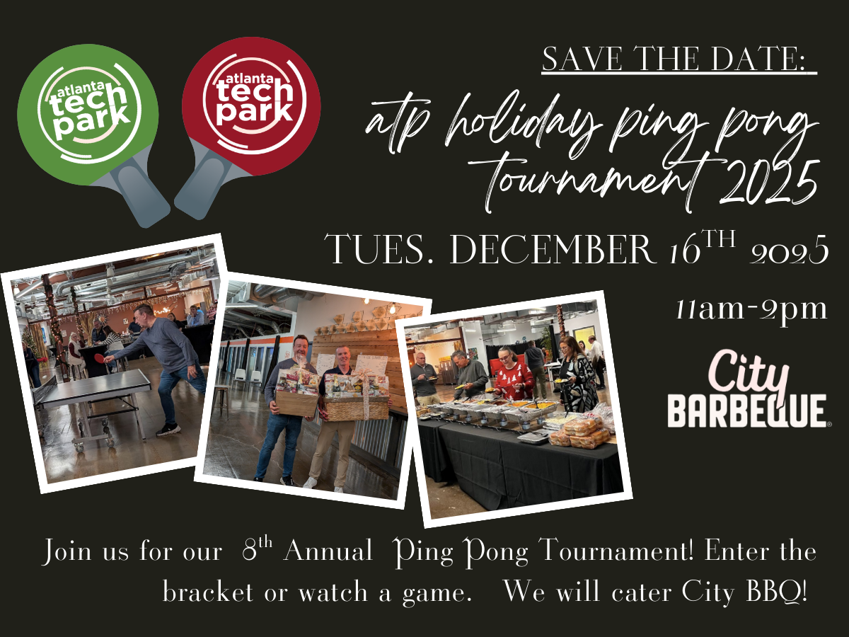 Join us for our 8th Annual Ping Pong Tournament at Atlanta Tech Park! Enter the bracket or watch a game. We will cater from City BBQ! Learn more here.