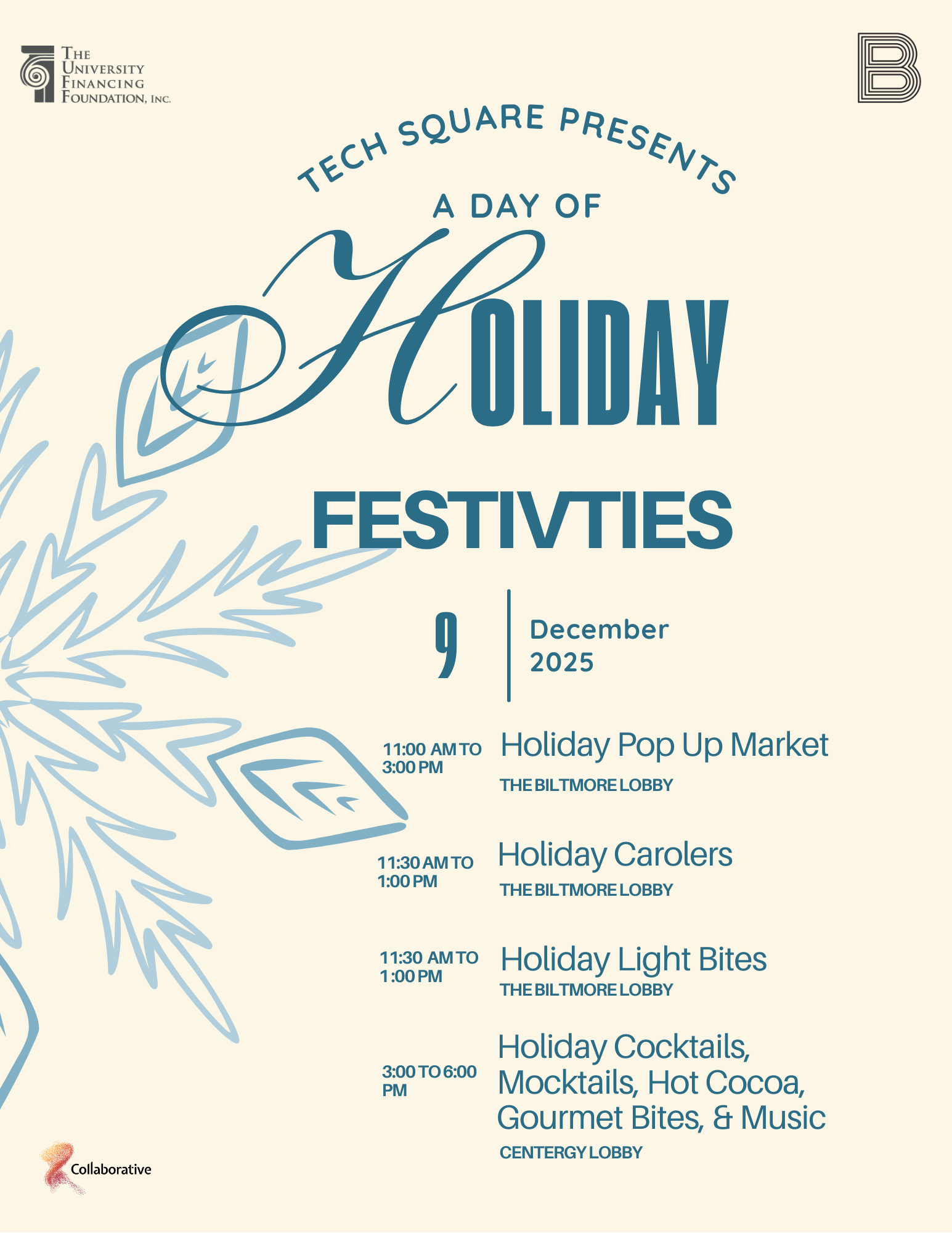 Beginning with a holiday market and carolers at The Biltmore and culminating in the annual Centergy Lobby holiday party featuring food, drinks, and live music, Tech Square is ready to come alive with the holiday spirit. Learn more here!