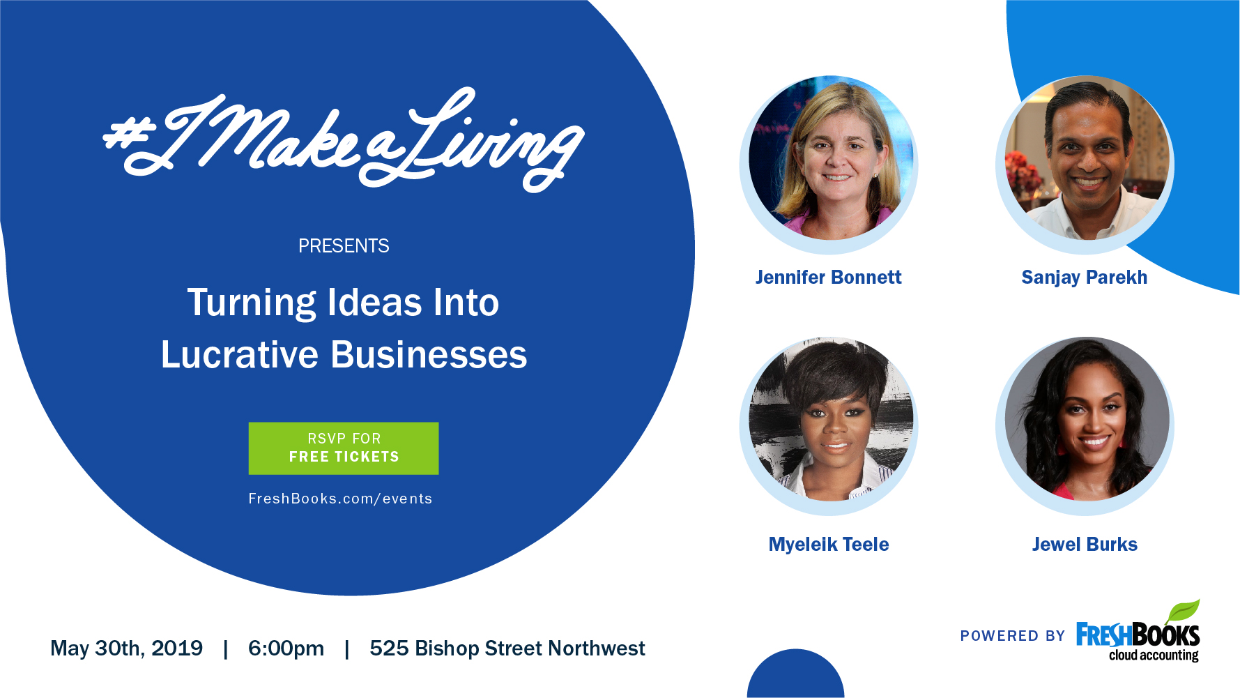 Coming to Atlanta on May 30, #imakealiving will bring together a group of successful entrepreneurs, freelancers, and small business owners for a lively and candid conversation. You'll hear from Jewel Burks, a founder whose startup was acquired by Amazon; Jen Bonnett, former General Manager of the Advanced Technology Development Center and founder of Startup Chicks; serial technology entrepreneur Sanjay Parekh; and Myleik Teele, founder of the first monthly subscription service for curly hair.