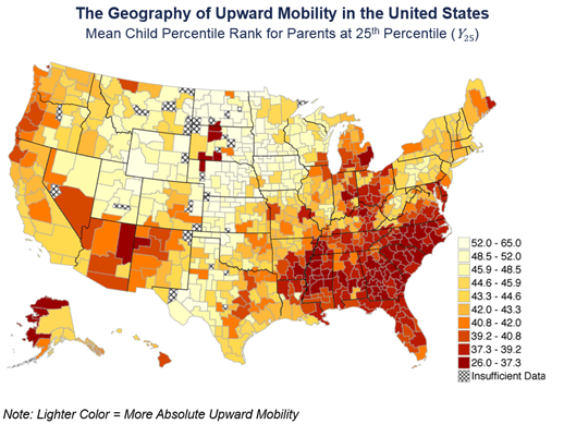 Southeastern readers looking at the below chart of the U.S. from the Brookings Institute may very well feel discouraged. This 2018 visualization demonstrably shows how the Southeast is the worst region in the country when it comes to upward economic mobility.