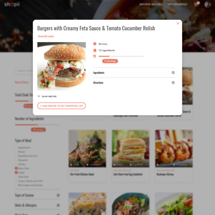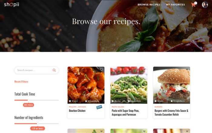 Grocery Shopii integrates into a grocer's website. The consumer goes to the store's site (or app) to search through 500,000+ recipes.