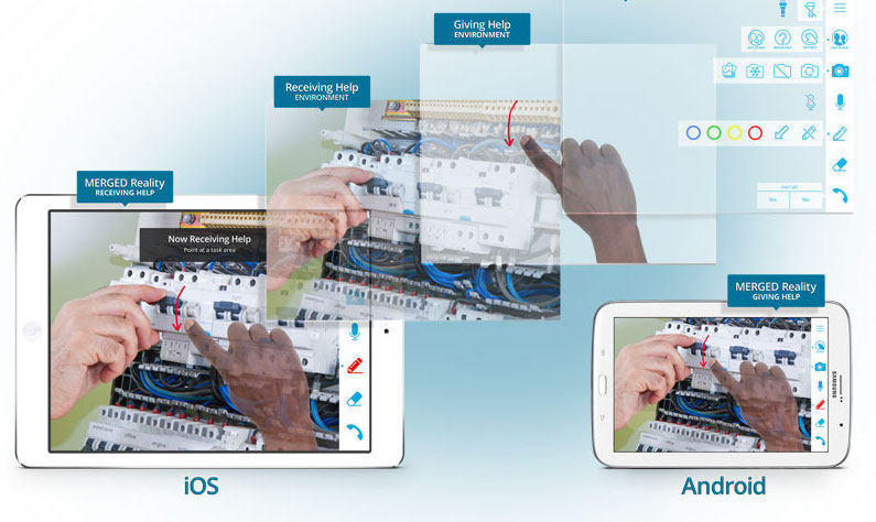The mobile app is available on iOS and Android. "[As the customer,] I'll point my phone at the problem domain, then be able to use the phone camera to put my hands in my field of view and now the expert can see his/her hands and the customer's hands and equipment in the same view," says York.
