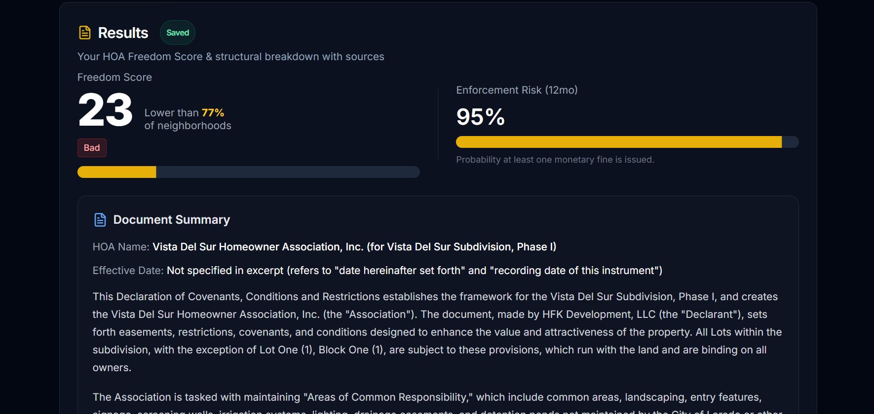 Homeowners and prospective homeowners can upload important HOA documents into the platform and receive a Freedom Score, which tells users in plain English about likely fine risks. The score also highlights clauses linked to aggressive enforcement, recurring fines, surveillance, rapid lien escalation, and vague language issues.