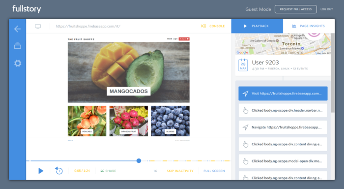 The FullStory platform is kind of like Google Analytics, plus the very best team of (automated) customer support agents you’ve ever had. But that doesn’t really encompass the “full story.” Once the customer adds FullStory into their website, the user dashboard can give product teams full insight into what visitors are doing — every click, button press, page transition and more.