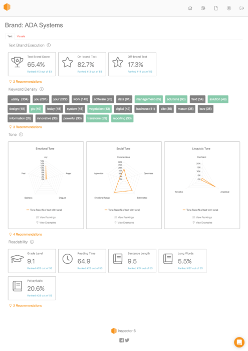 After submitting your brand standards, including strategy, markets, messaging, and visual identity, into the web application's online brand book, Inspector 6 will review your current assets. It then provides marketing teams with brand-specific insights, changes and recommendations to re-focus your voice and tone.