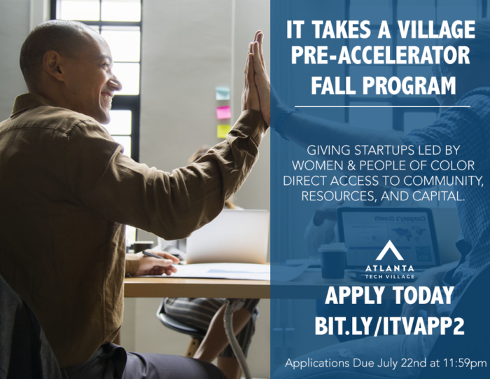 This year, tech hub Atlanta Tech Village launched its first ever It Takes A Village Pre-Accelerator Program focused specifically on startups led by women and people of color. 11 startups were accepted into the six-month program to receive an interactive educational curriculum, access to investors and resources to help advance their startups to the next level.