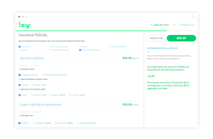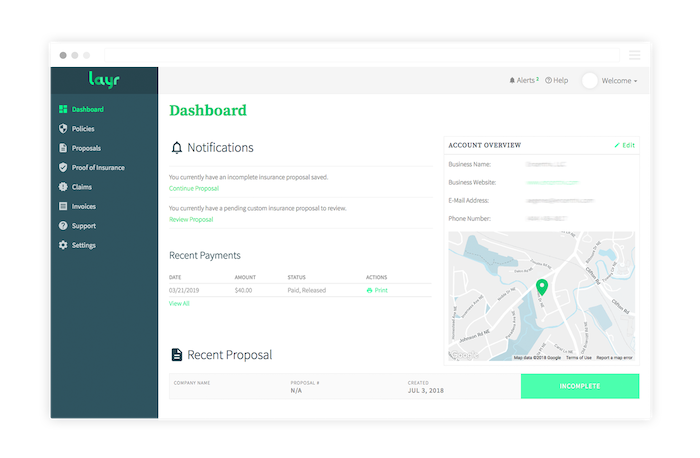 Once the business is insured, Layr’s online portal automates simple tasks like generating certificates of insurance and initiating claims. And all of it is paid for with one simple monthly fee that can be paid online with a credit card.