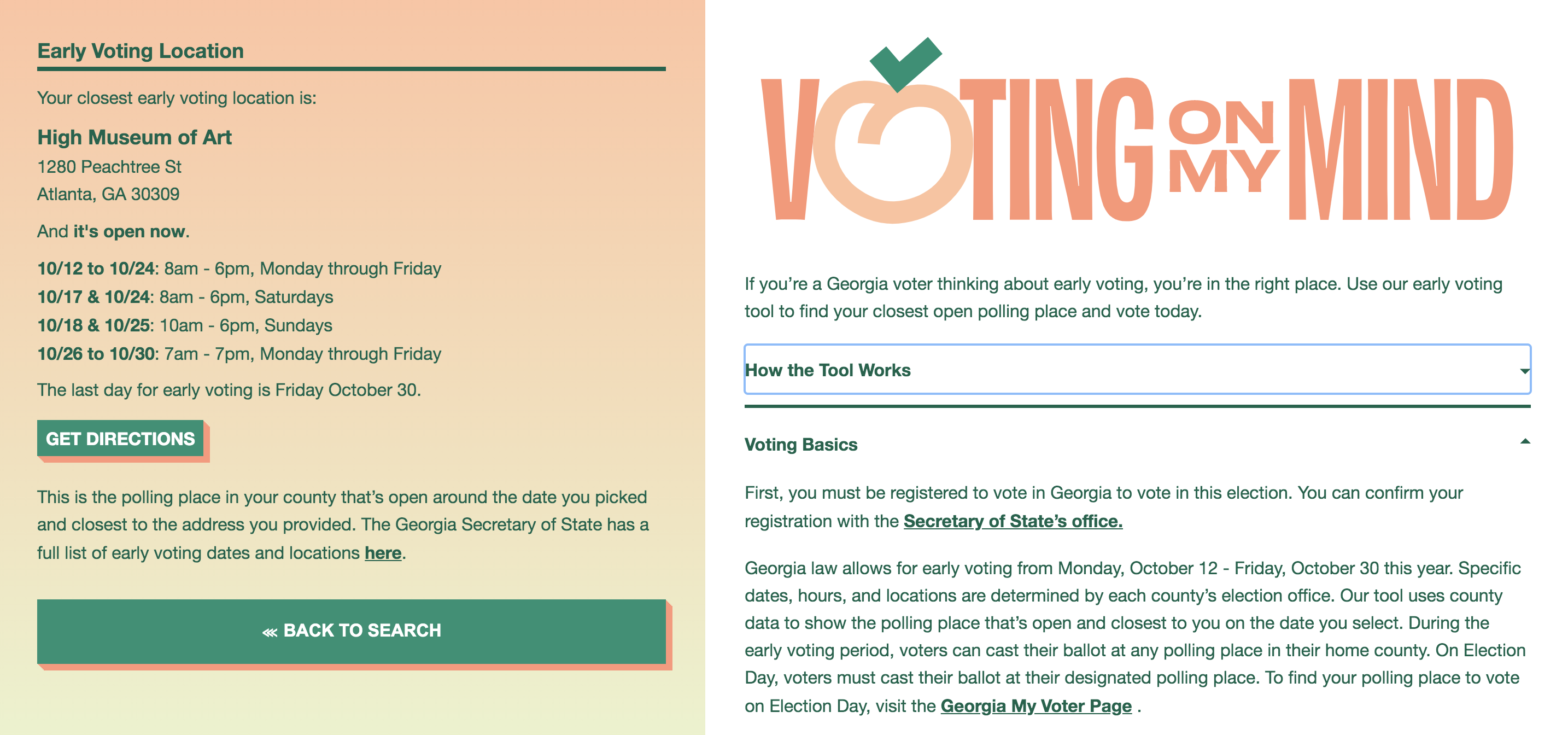 “This year, we wanted to do more and try to make early voting easier for Mailchimp employees and all of our neighbors in our home state of Georgia. As a technology company, we were able to create Voting on My Mind quickly and in a user-friendly way,” continued Shakespeare.
