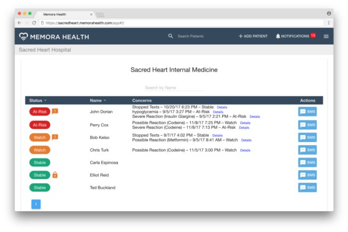 Poor treatment adherence and care results in nearly 70 percent of U.S. hospital admissions at a cost of 125,000 American lives and $300 billion in healthcare spending per year. Memora Health helps patients after they leave the hospital by sending them discharge instructions, addressing their health concerns, and collecting follow-up health metrics through text message.