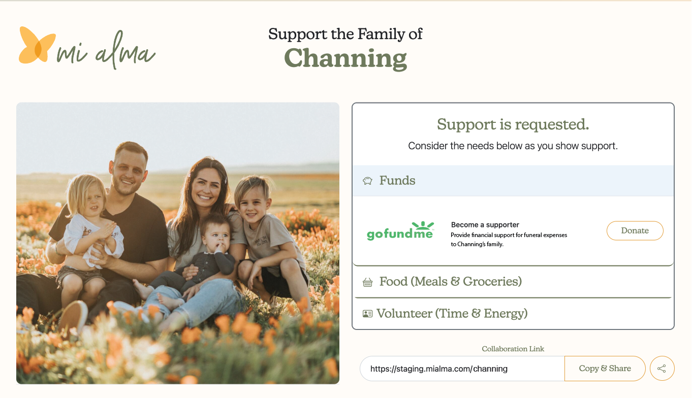 The link also serves as a central location to organize meal trains, fundraising pages, and third-party support efforts. This can help ensure well-intentioned assistance is pointed in the right direction to best support grievers.