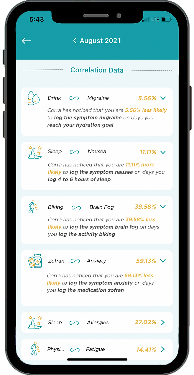 The app is designed to be a hyper personalized health log and provide insights based on an individual user’s tracking needs. Corra can start providing actionable insights after at least 35 days of data is collected.