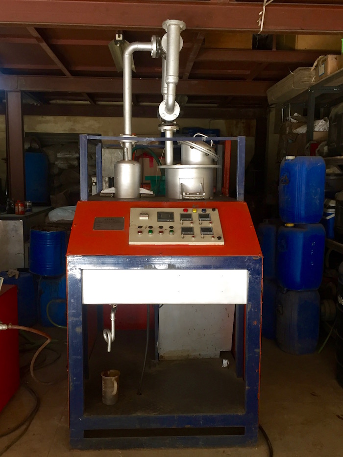 Neowaste's plant first transitions plastic into a molten liquid state and then vaporizes it. The vapors go through the catalytic converter and come in contact with their patented catalyst — the most unique part of their technology, says Findley.