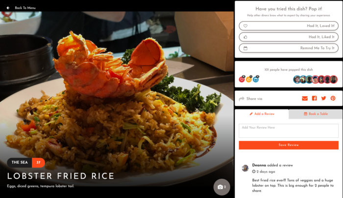 Popmenu allows the restaurant to add photos of specific dishes and pair them with reviews right next to it.
