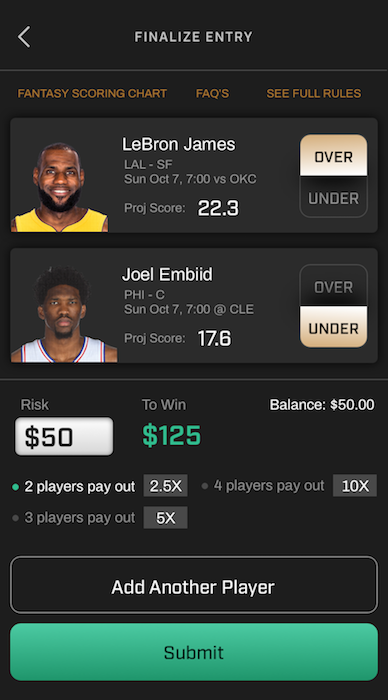 PrizePicks, available as of this week on iOS, is incredibly simple. Each day, users have a new opportunity to select two, three or four players from a curated board drawn from various sports (basketball, football, baseball, soccer and golf). The user then tries to predict whether each player will go over or under their projected fantasy score. They enter a dollar amount, minimum $10, maximum $100.