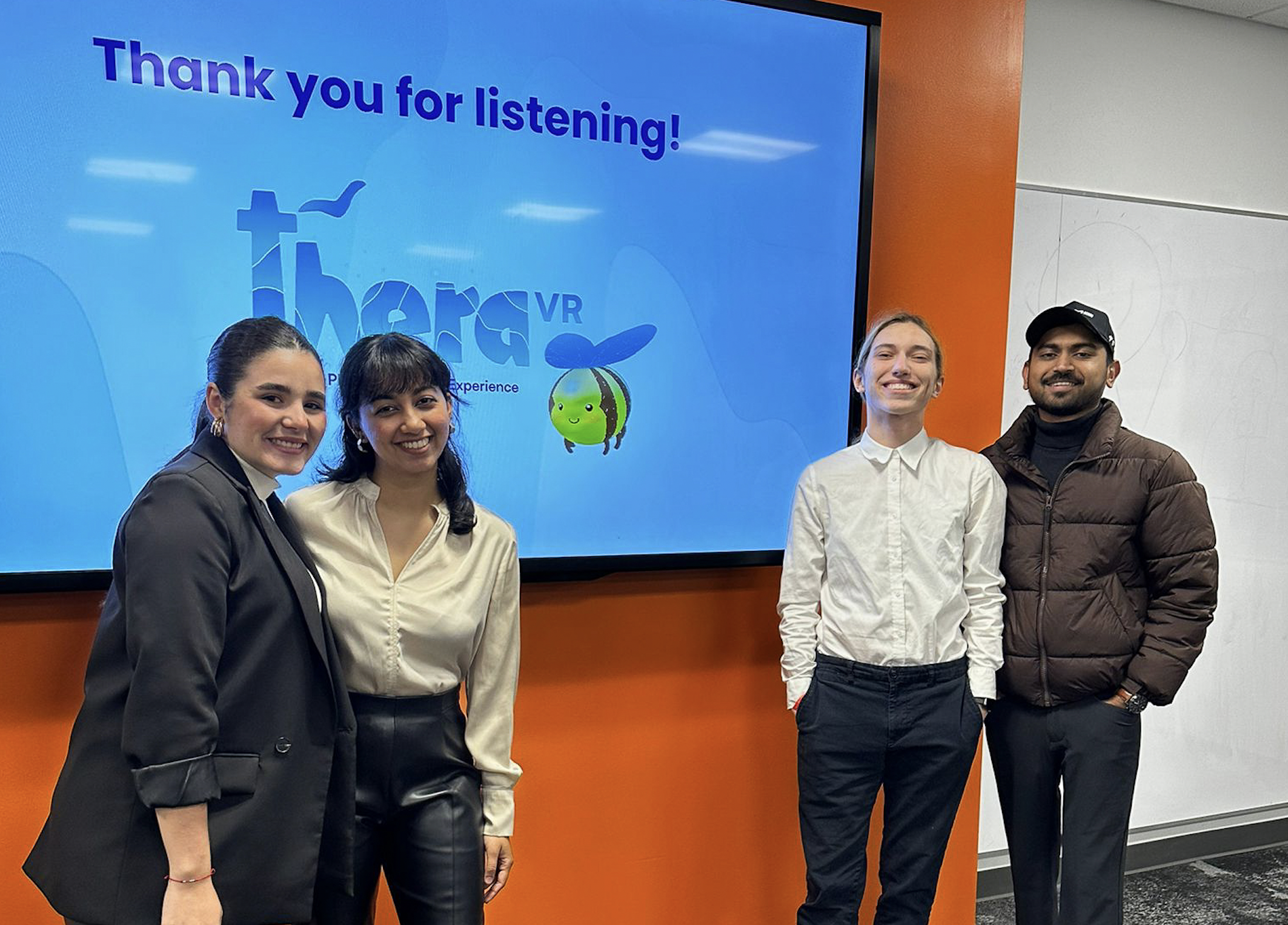 Instead of just doing repetitive movements while staring at a wall, children can be transported to a river to kayak or a mountain to ski while they work on their fine motor skills. Khushi Bhatt, Andrea Castro Yanes, Yash Patel, and Phoenix Hunt are the students behind TheraVR.