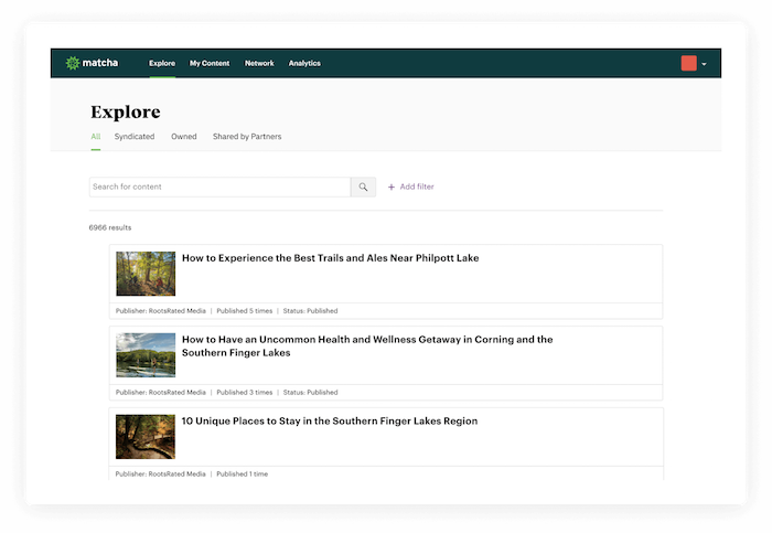 Though RootsRated.com will remain populated with content, the whole team is really focusing on Matcha, according to company representatives. The expanded content marketing platform functions in much the same way as Compass — it contains 10,000 articles available for licensing, the freelancers network, paid social media planning and management, and data analytics on content performance.