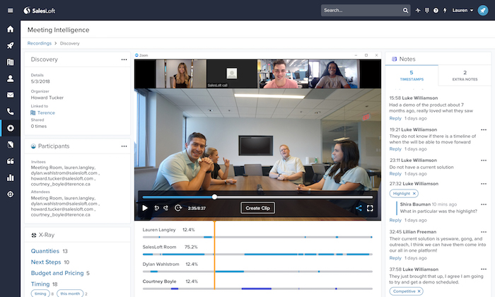 Meeting Intelligence, which will be offered natively in the platform as part of SalesLoft’s SaaS-based, tiered-pricing services, works by joining in on the salesperson’s phone or video call with potential customers, listening and analyzing in real-time, and recording for later use. The tool (which is compliant with recording regulations through the use of Smartlogic) stores the whole conversation, converts it to text, and analyzes based on keywords and results.