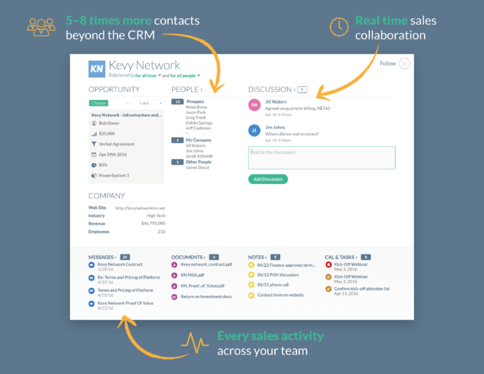 We transcend the silos of data that lives in CRM, lives in calendars, lives in emails, lives in Dropbox, and we provide a single pane of glass. It shows sales leadership everything that’s going on with the relationship in real-time.