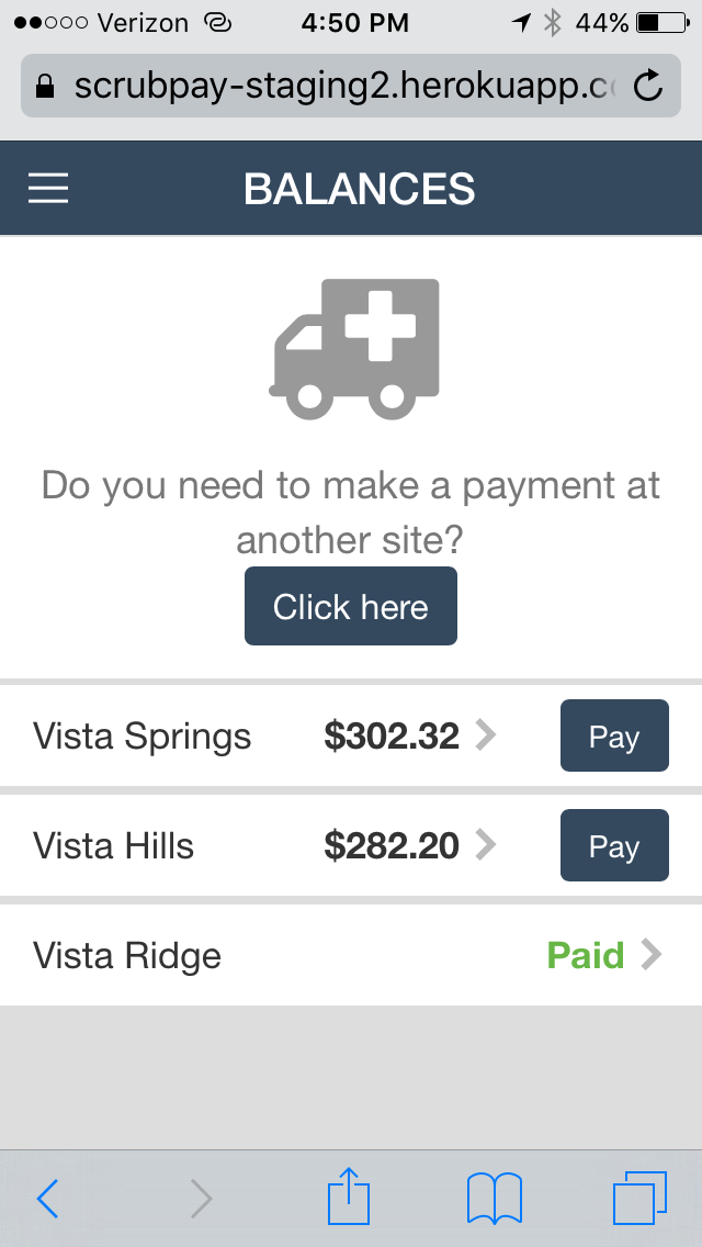 After running the numbers, at any given hospital anywhere from 60 to 90 percent of people with self-pay balances don't pay. It's not necessarily their fault. It's often the hospital's fault, since they don't provide a quick, simple, easy way to pay, and so that's what we built. Instead of receiving a statement in the mail, you now have the ability to receive a text message, click on the link in the text message to take you directly to our application and pay your bill. It already has all the information, from what hospital you visited to how much you owe.