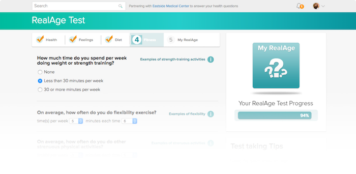 Sharecare's web-based platform and app offers users a suite of personalized and predictive health solutions. That includes a diagnosis tool, AskMD, personalized health content on a range of physical and mental health topics, health guides, a Find A Doctor feature, and more. Users are onboarded by completing the company's proprietary health assessment, the RealAge Test.