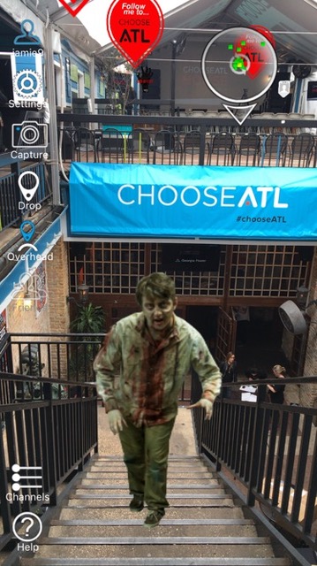 The user opens the app and lifts their phone up to the sky to see virtual AR signposts around them — think an augmented reality billboard. They can also drop a pin to, for example, find their car in a busy parking lot or a friend at a festival — adding a new layer to the social experience without being intrusive. A business can use the app to create info posts for users to find when approaching your business or add fun moments like ChooseATL did at SXSW 2017 by featuring zombies around their activation house.