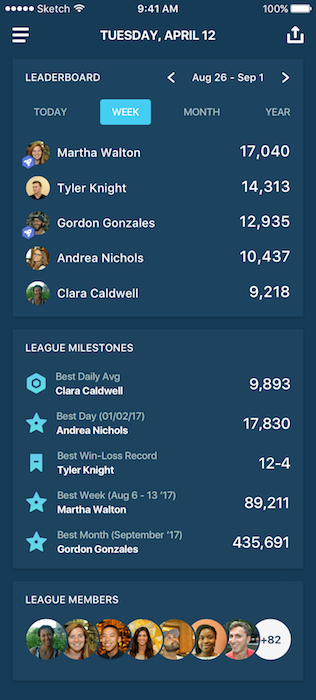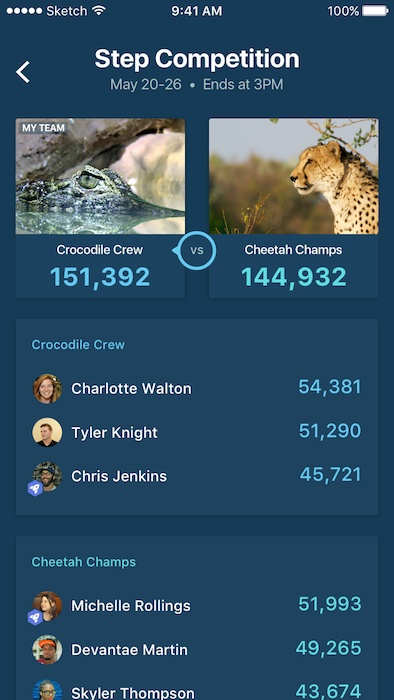 We built Rove to open up this powerful experience to everyone. Now, you can track your steps with any group of people and start competitions with the push of a button. We automatically divide your League into two teams, which compete for a week. Users can see real-time leaderboards to see who's winning. Each new competition has rebalanced teams to keep things interesting and fair.