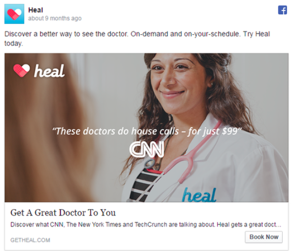 Here's an example of a well-done website clicks/conversions Facebook ad from startup Heal. This B2C campaign was targeting a wide audience of consumers with the objective to get them to take a desired action, making this platform and ad format an excellent choice. In addition to picking the right ad type and platform, this ad also hits the mark creatively. The copy is clear and compelling and makes the customer pain points a focal point in the messaging. Finally, there is a strong call to action.