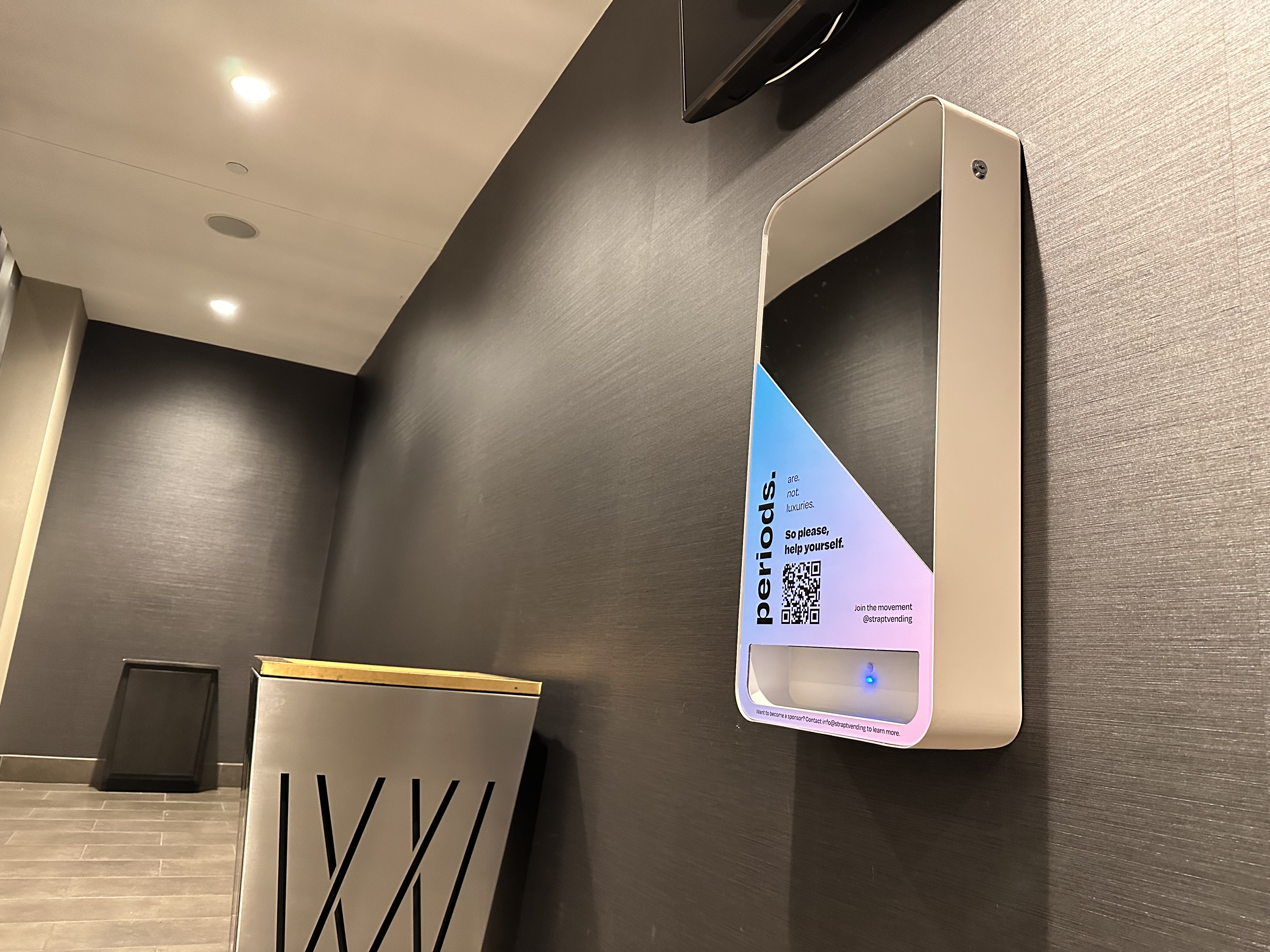 Strapt machines are trendy, space efficient, battery powered and LTE connected, so there is no wifi requirement for location partners. Their remote inventory support, combined with provided dispensers and product, creates a low maintenance system for partnering facilities.