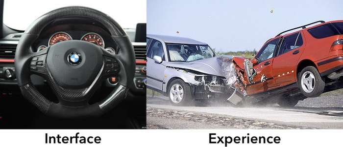 UX is the overall feeling you get from using something. You grab the steering wheel to drive a car, but how you feel while you're driving is the experience. Getting into a wreck is also an experience, and one you experience through the interface. Taking it back to an app, being frustrated when a button doesn't do what you expect is part of the experience, like the car wreck. Good UX design should help people avoid those wrecks by thinking about how things will be used and creating something that works the way they expect it to.