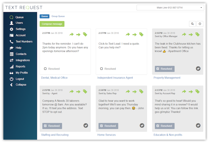 Text Request is an online texting service for businesses. Users log in to our dashboard from any device to send and receive texts using their current office numbers.