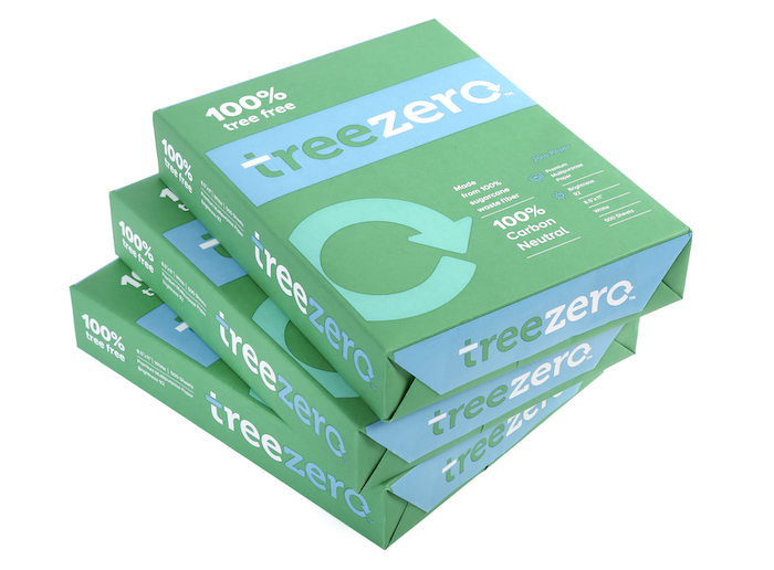TreeZero's high-quality paper is made up of sugarcane waste fiber, a material that is usually burned or wasted in landfills. Manufacturing it emits 42 percent less CO2 emissions than manufacturing virgin paper, but to make up for any emissions, the team also purchases carbon credits to combat deforestation in Africa.