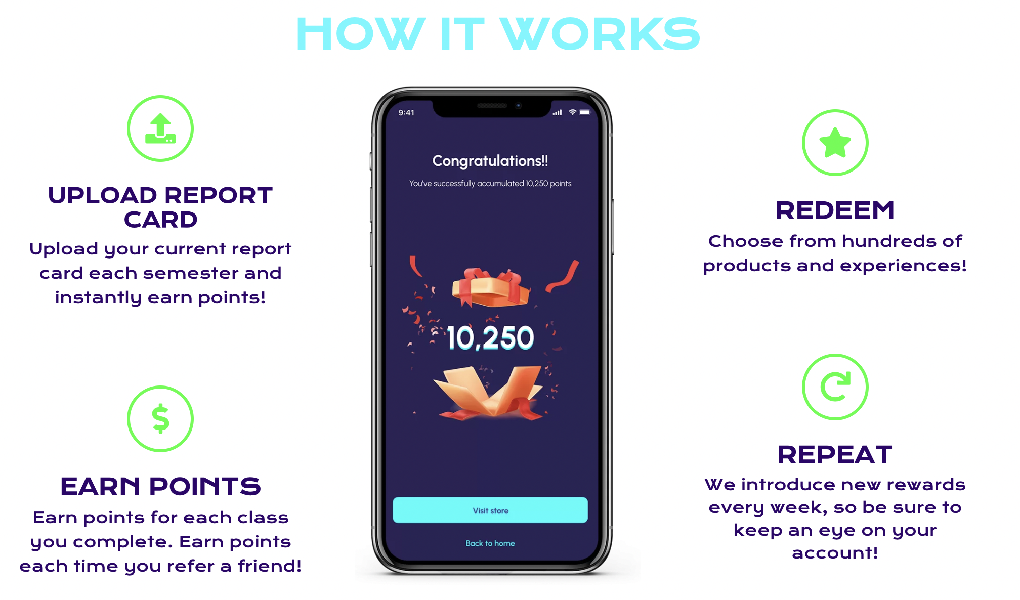 Students – whether in kindergarten or college – upload their report cards and test scores. The platform assigns points according to the grade received. Students then use their points as cash, in the form of digital gift cards, through Schoolconomy’s rewards partners. There are currently 11 reward partners – ranging from Bar Vegan to Divine Timing Watches.