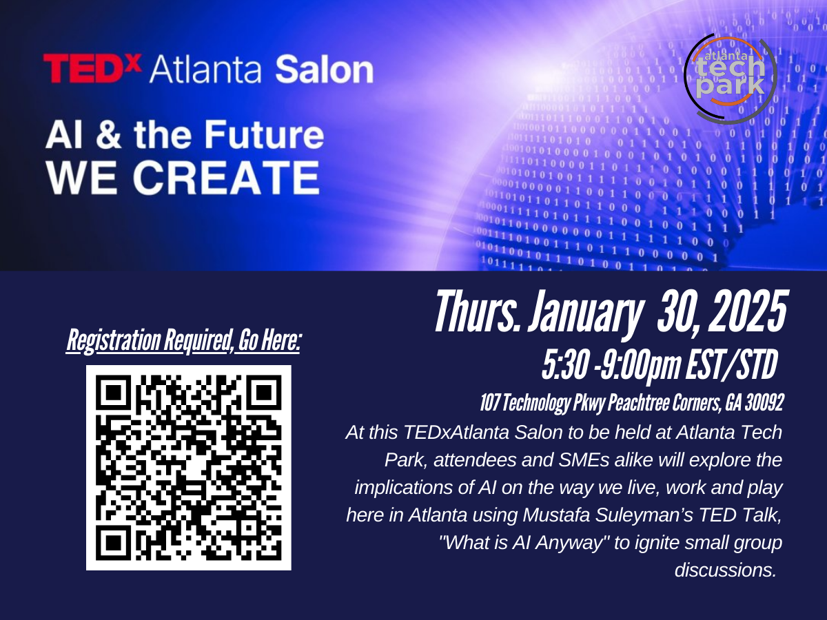 Artificial intelligence is reshaping the fabric of society, influencing everything from how we work and communicate to how we innovate and solve global challenges. Its impact extends across industries, communities, and individual lives, offering unprecedented opportunities while raising critical questions about its role in the future we create. At this TEDxAtlanta Salon, attendees and SMEs alike will explore the implications of AI on the way we live, work and play here in Atlanta using Mustafa Suleyman’s TED Talk, “What is AI Anyway” to ignite small group discussions. RSVP here.
