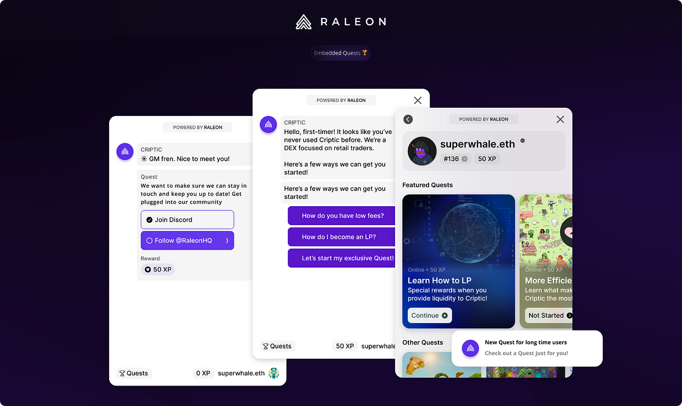 The startup Raleon works to improve in-app engagement by “incentivizing and rewarding user behavior” in Web3 spaces. The goal is to give brands a “platform that not only lets them understand their users, but engage them in-app in a hyper personalized way,” Snell added. The startup does this through Embedded Quests, which are no-code “conversational, chat-like” experiences that allow brands to personalize how they talk to customers on their own websites.