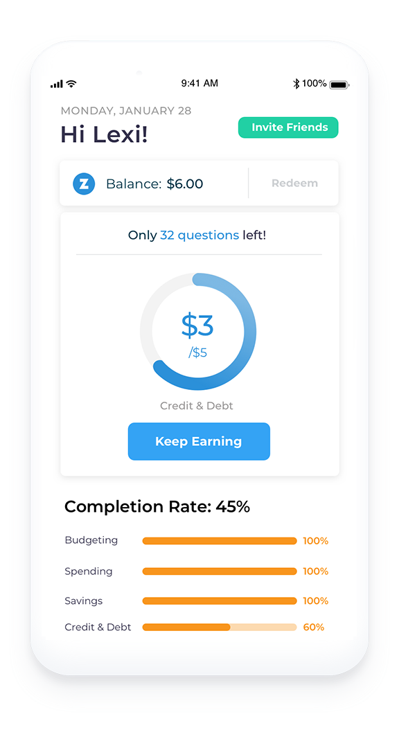 The user goes through short, snackable educational modules, earning small payouts when they answer questions correctly.